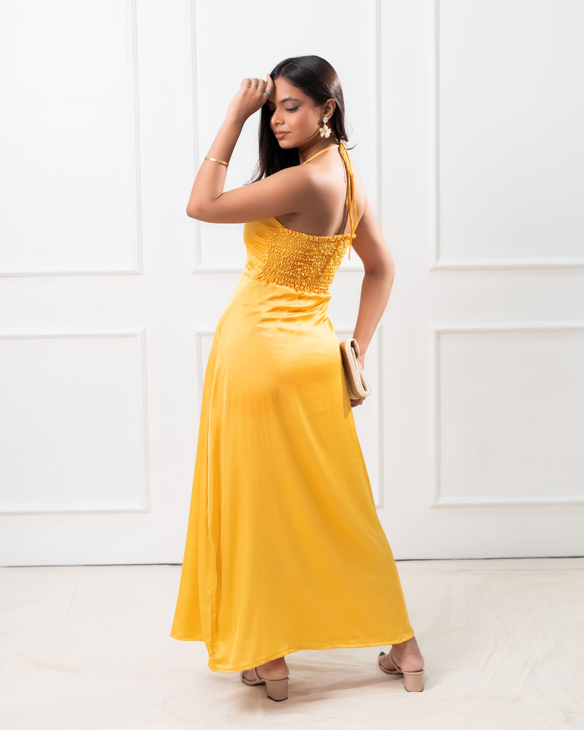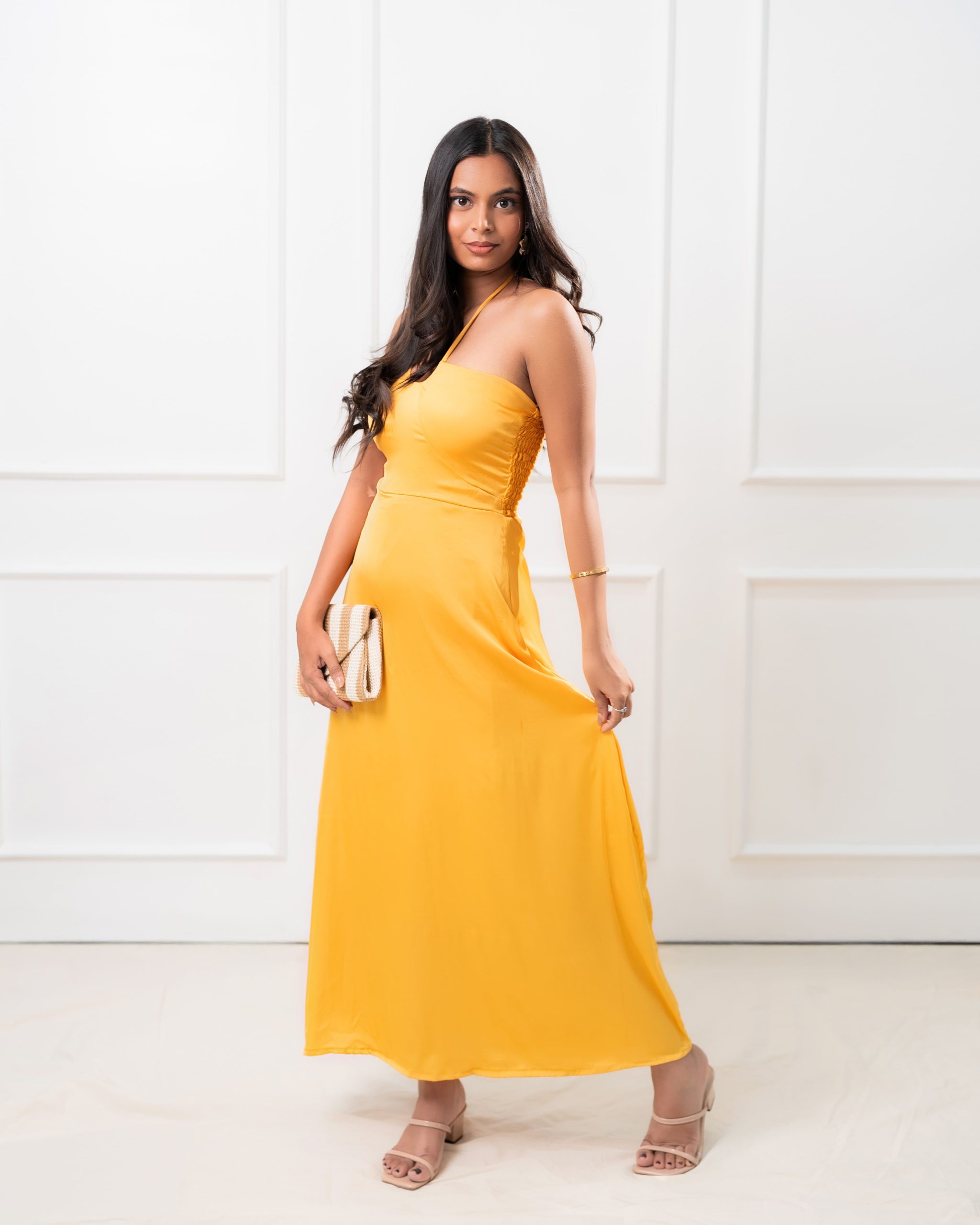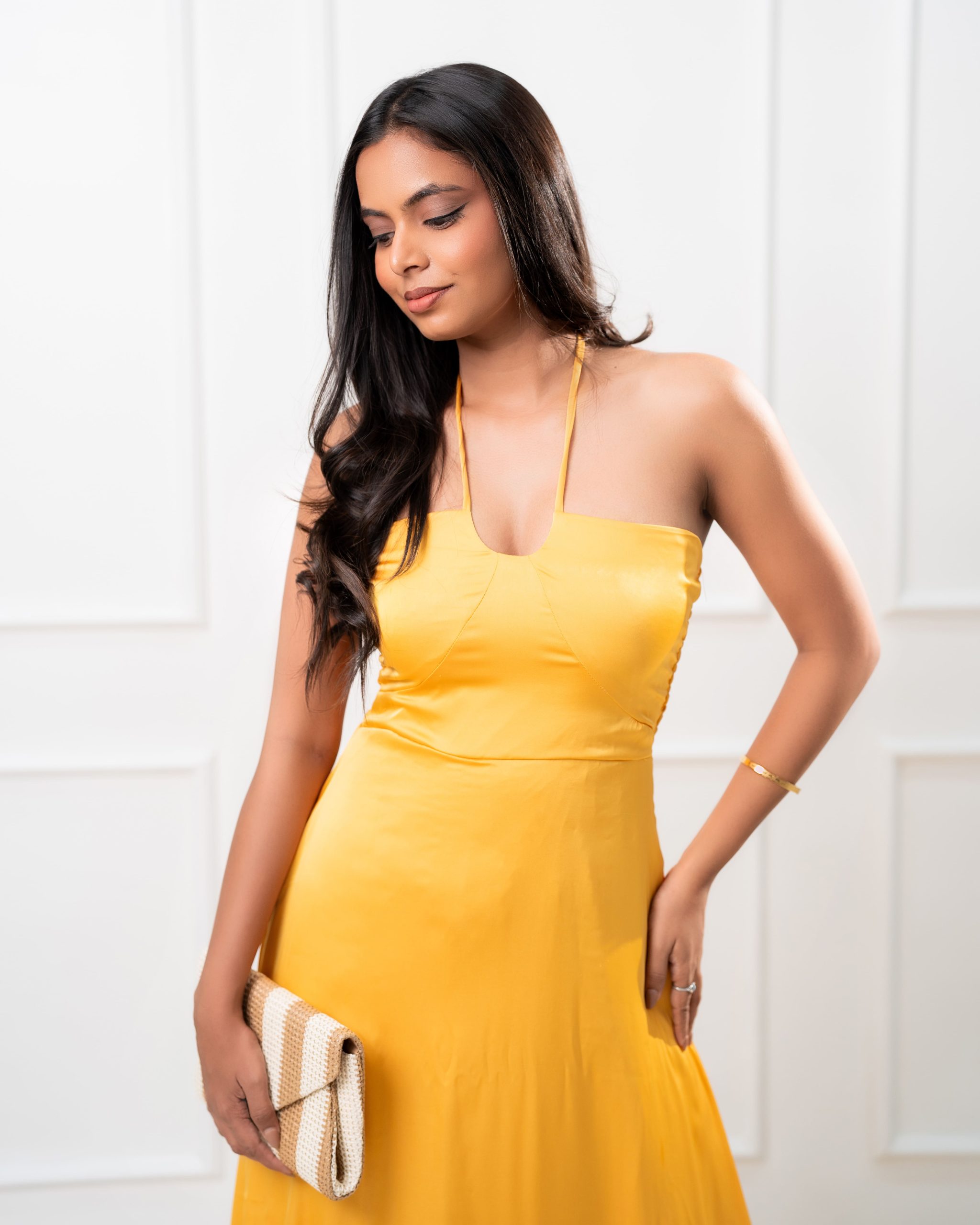Crafted in a luxe feel polyester blend, this halter dress is perfect for evening events, dinners, and statement nights out.